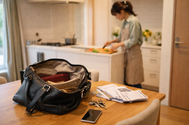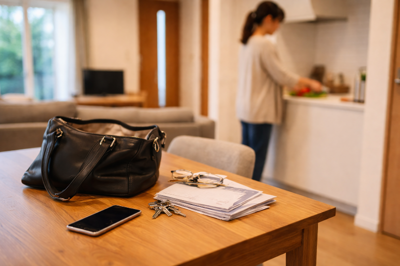 例えば、帰宅後にバッグをテーブルに置き、中身を出して確認。そのまま夕食の準備を始めると、出した物はテーブルに残ります。
