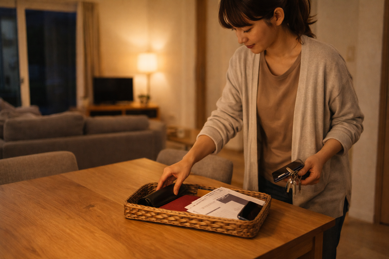 玄関近くに小さなカゴやトレーを設置すると、テーブルへの集中を防げます。重要なのは「完全に禁止する」のではなく、置き場所を変えることです。